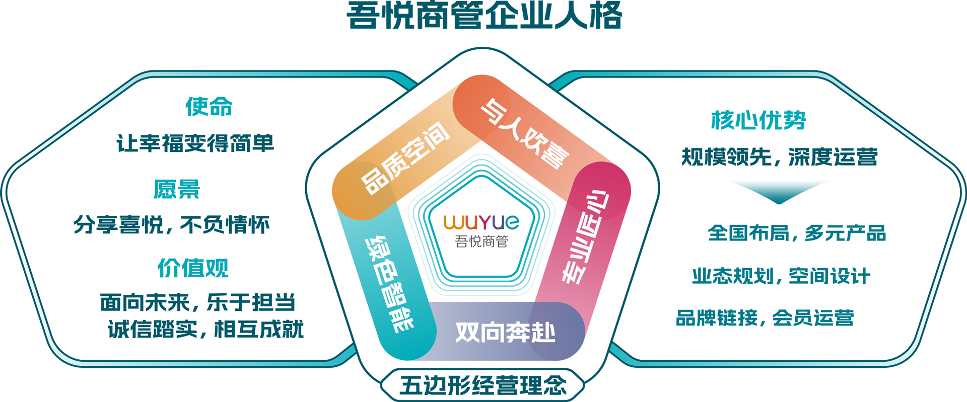 “吾悦商管企业人格”于2024年吾悦商管品牌私享会“大漠有悦”中正式发布。以新城控股的“使愿价”为初心,以吾悦广场“规模领先、深度运营”的核心优势为信心,以“五边形”经营理念作为新征途上始终坚持的恒心,这三者共同构成了“吾悦商管企业人格”。吾悦商管的“五边形”经营理念,包括“品质空间、与人欢喜、专业匠心、绿色智能、双向奔赴”。